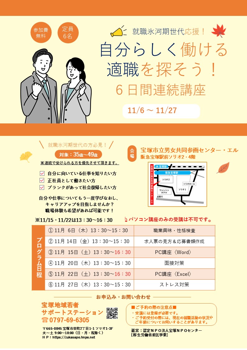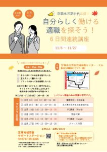 就職氷河期世代向け講座⑥ストレス対策(定員6名) 2025年11月27日(木) 13:30~15:30 (定員6名) 就職氷河期世代(35歳~49歳)の方向けの6日間連続講座の最終回です。 最終回は、ストレスの原因や、ストレスを上手にコントロールする方法を一緒に考え、学びます。 自分や仕事の理解についてもう一度学びなおし、キャリアアップを目指しませんか?