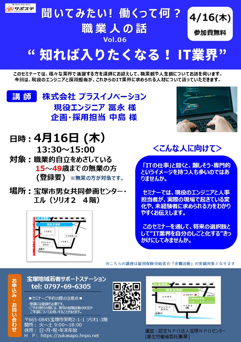 職業人の話~知れば入りたくなるIT業界~ 2026年4月16日(木) 13:30~15:00 (定員6名) このセミナーでは、様々な業界で活躍する方を講師にお迎えして、職業観や人生観についてお話を伺います。 今回は、現役ITエンジニアと採用担当者が登壇。 「現場のリアル」を語ります。
